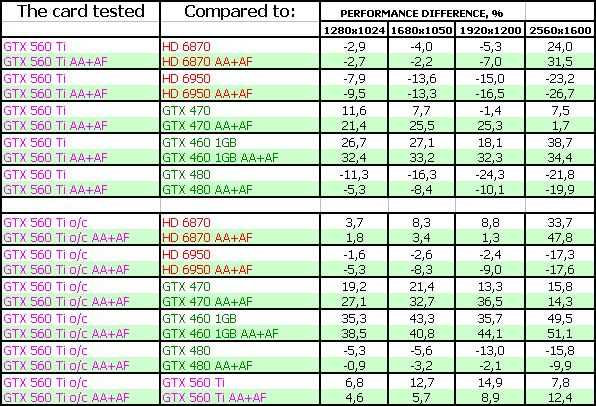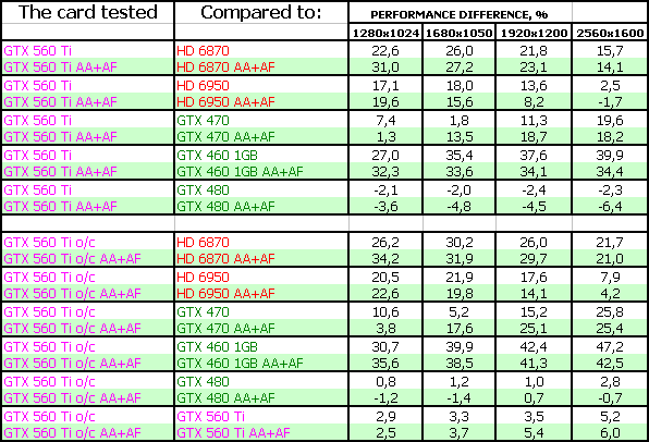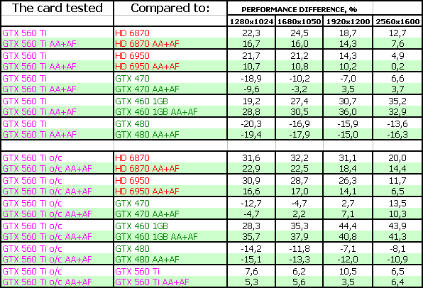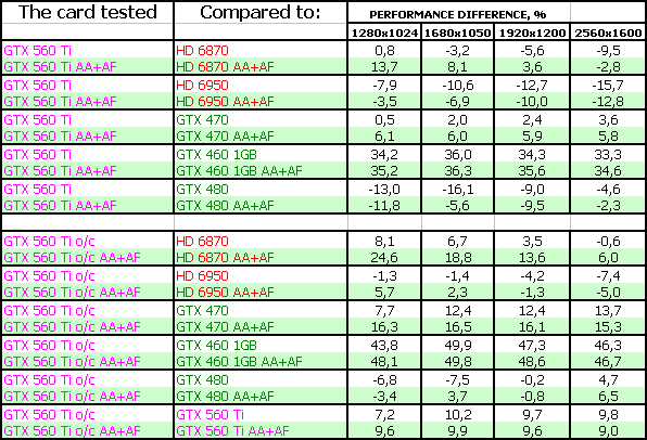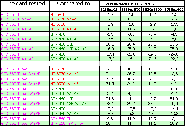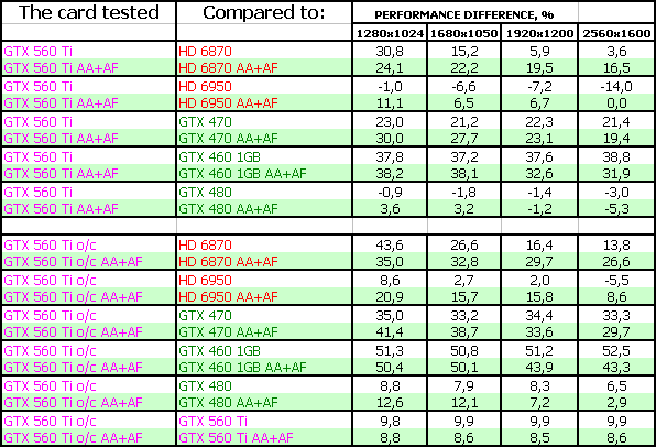 Наше предфинальное заключение: если стомость GTX 560 Ti будет рядом с Radeon HD 6870 (пусть даже и чуть выше), то, несомненно, надо покупать GTX 560. Эта карта реально отправила на покой Geforce GTX 470 и в целом семейство GF100 — 470/480 морально умерло и ушло в историю. К тому же, как мы могли уже убедиться, GTX 560 Ti очень хорошо разгоняются, и потому мы не исключаем массового появления на прилавках от партнеров Nvidia всевозможных Turbo-версий с повышенными частотами, а, следовательно, такие карты могут уже догонять даже 6950. Однако если цена будет столь высокой, как ее рекомендуют, то с той же уверенностью можем сказать, что надо покупать иные карты.