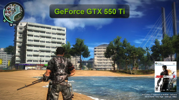 Настройки Just Cause 2 на старой видеокарте Nvidia при 30 FPS получаются лишь минимальные («Lowest» в терминах игры) и при этом рендеринг ограничен разрешением 1280×1024, без включения полноэкранного сглаживания. С той же скоростью с игрой справляется Geforce GTX 550 Ti, но при очень высоких («Very High») настройках, в разрешении 1680×1050 и с включенным сглаживанием MSAA 4x.