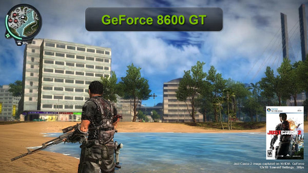 Соответственно, при модернизации с Geforce 8600 GT до GTX 550 Ti пользователь не просто получит большую частоту кадров в играх, но и сможет повысить графические настройки в абсолютном большинстве игр с минимальных и средних до очень высоких или даже максимальных. Это вызовет заметное невооружённым глазом улучшение качества рендеринга. В качестве примера приведём скриншоты из Just Cause 2, которые сняты на Geforce 8600 GT и Geforce GTX 550 Ti при одинаковой производительности около 30 FPS.