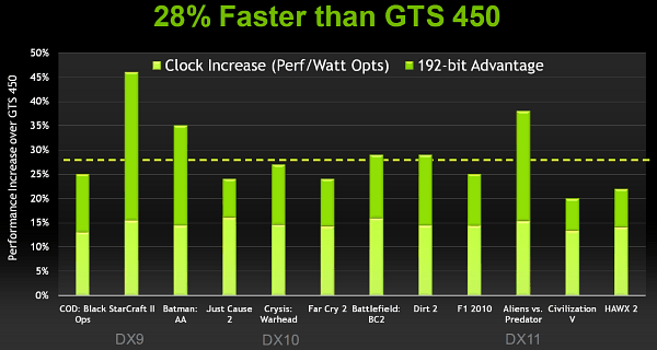 Подобное повышение теоретических характеристик вызывает рост практической производительности рендеринга в играх, особенно в случаях, когда скорость ограничена ПСП видеопамяти. Судя по тестам самой Nvidia, при типичных для GTX 550 Ti настройках (1680×1050 и MSAA 4x), одно только расширение шины до 192-бит даёт порядка 14% в среднем, а в случае некоторых игр даже выше (StarCraft II — 31%, Aliens vs Predator — 23%, Batman: Arkham Asylum — 21%).
