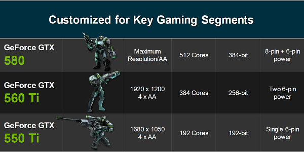 Естественно, что для Geforce GTX 580 нет никаких преград по разрешению и уровню MSAA, средним уровнем Nvidia признаёт Geforce GTX 560 Ti и разрешения вроде 1920×1200 или 1920×1080, вместе с включенным MSAA. Ну а выпущенному сегодня Geforce GTX 550 Ti достаётся сегмент недорогих мониторов с разрешением порядка 1680×1050 и менее, также с полноэкранным сглаживанием.