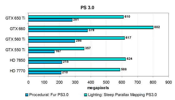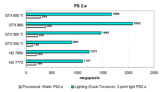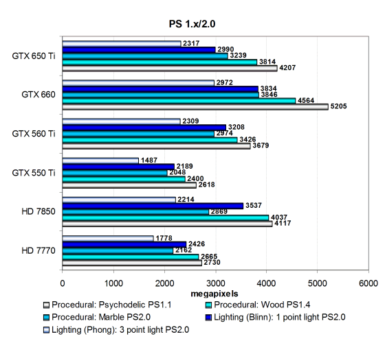Понятно, что Geforce GTX 550 Ti тут ловить вовсе нечего, новинка значительно опередила её во всех тестах, равно как и Radeon HD 7770. Посмотрим на результаты более сложных пиксельных программ промежуточных версий: