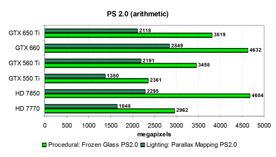 Но и во втором подтесте с более сложными попиксельными расчётами похвастать нечем. Результаты показывают, что эффективность выполнения сложных математических вычислений в пиксельных шейдерах у чипов архитектуры GCN выше, чем у GPU компании Nvidia. Radeon HD 7850 лишь немного уступает более дорогой Geforce GTX 660 в этом подтесте, да и HD 7770 совсем недалеко.