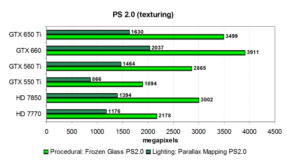 Тест компании Futuremark не показывает теоретически возможного уровня производительности текстурных выборок, но эффективность видеокарт AMD и Nvidia в нём достаточно высока и сравнительные цифры моделей довольно близки к соответствующим теоретическим параметрам, за исключением Radeon HD 7850, показавшей аномально низкий результат. В остальном получилось похоже на истину — новая Geforce GTX 650 Ti отстала от GTX 660 настолько, насколько и должна по теории. А последняя и по теории быстрейшая в текстурировании видеокарта, и в этом тесте.