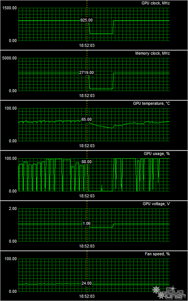 Мы провели исследование температурного режима с помощью новой версии утилиты EVGA PrecisionX (автор А. Николайчук AKA Unwinder) и получили следующие результаты.