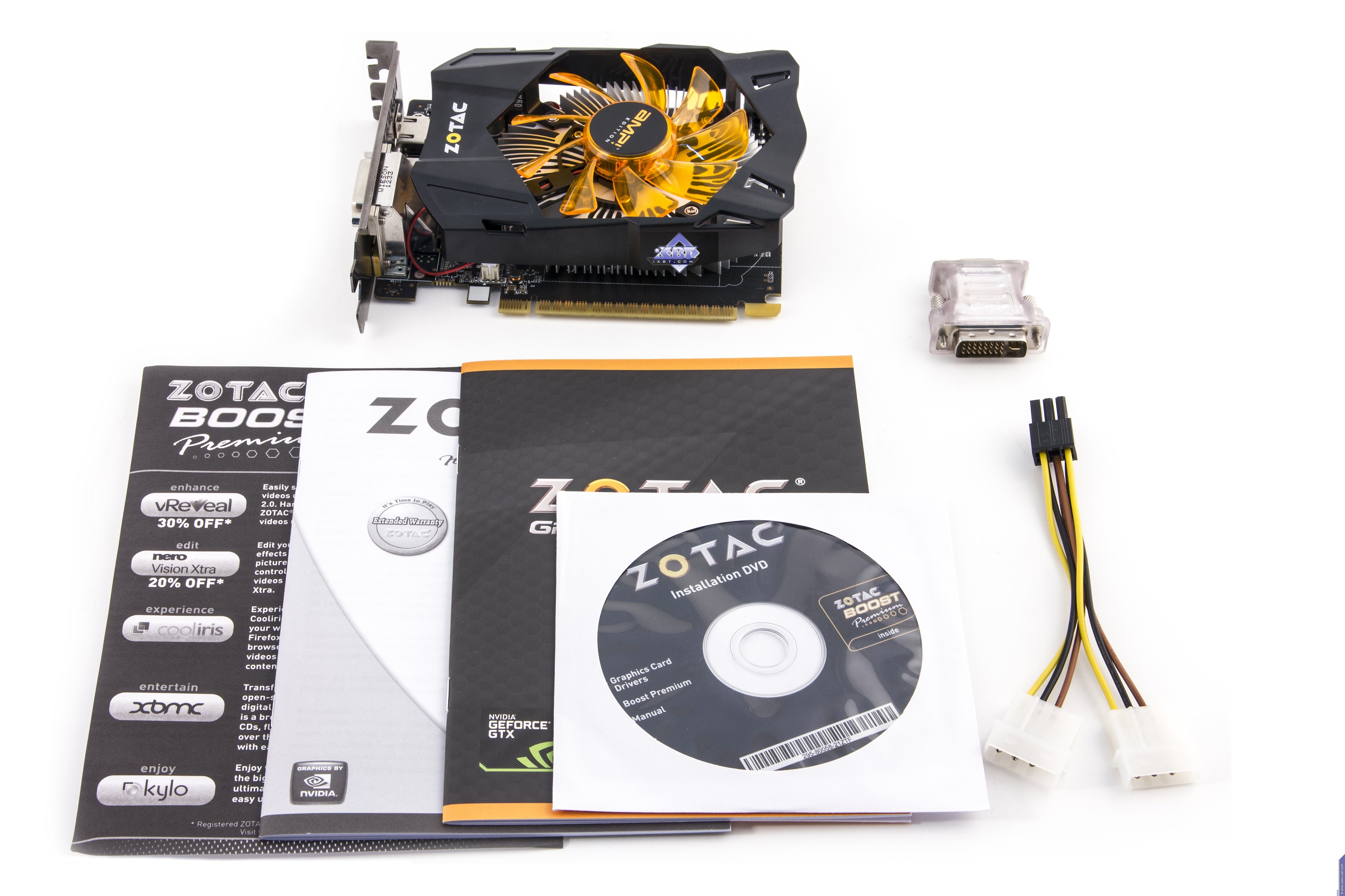 Перед нами базовый комплект плюс разветвитель на 6-контактный коннектор питания и адаптер DVI-to-VGA. | ![]() |
