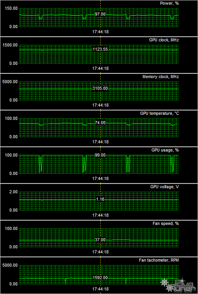 Мы видим, что после 6-часового прогона под нагрузкой максимальная температура не превысила 74 градуса по ядру, что для такого рода ускорителей очень хороший результат, учитывая еще и почти не шумящий кулер.