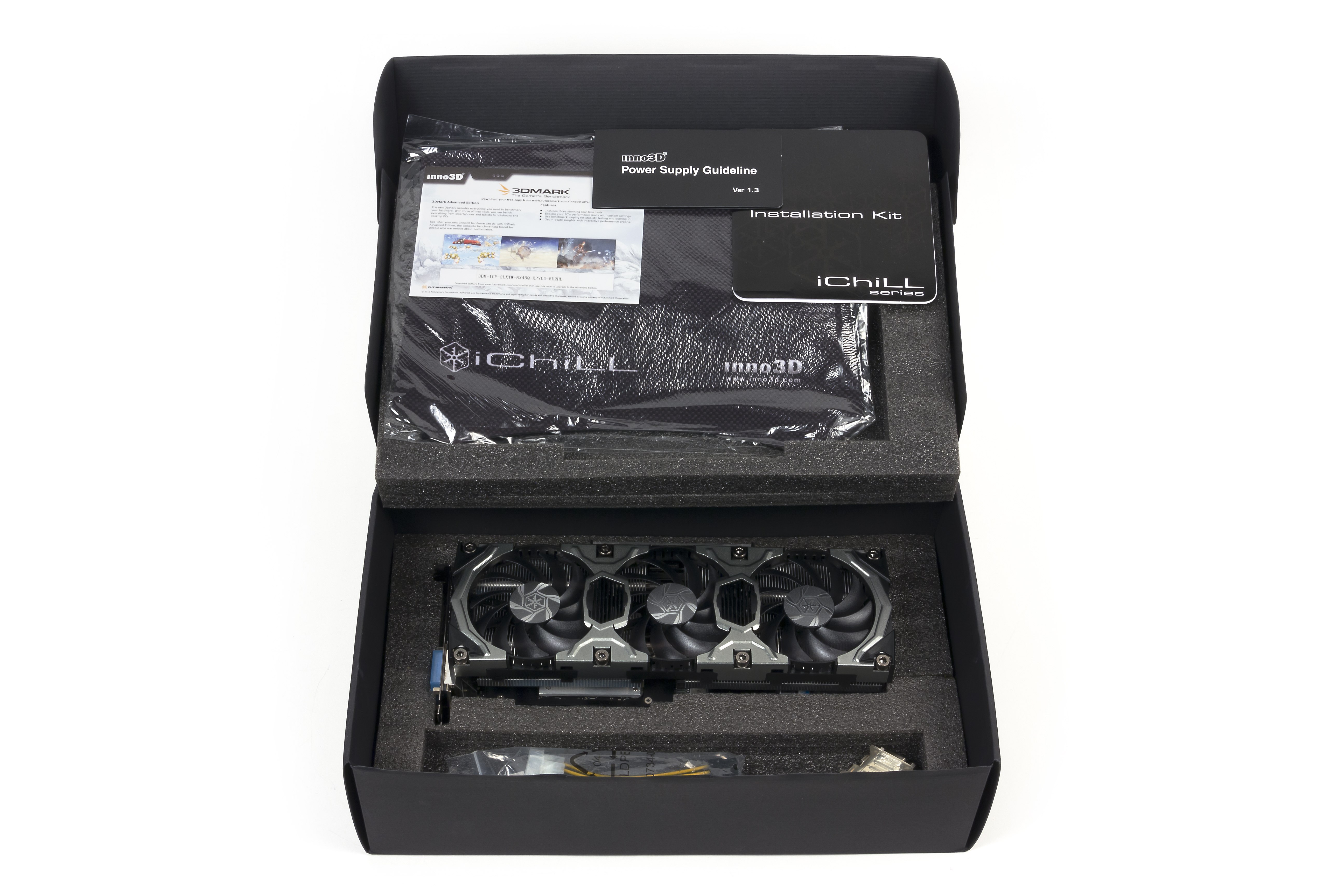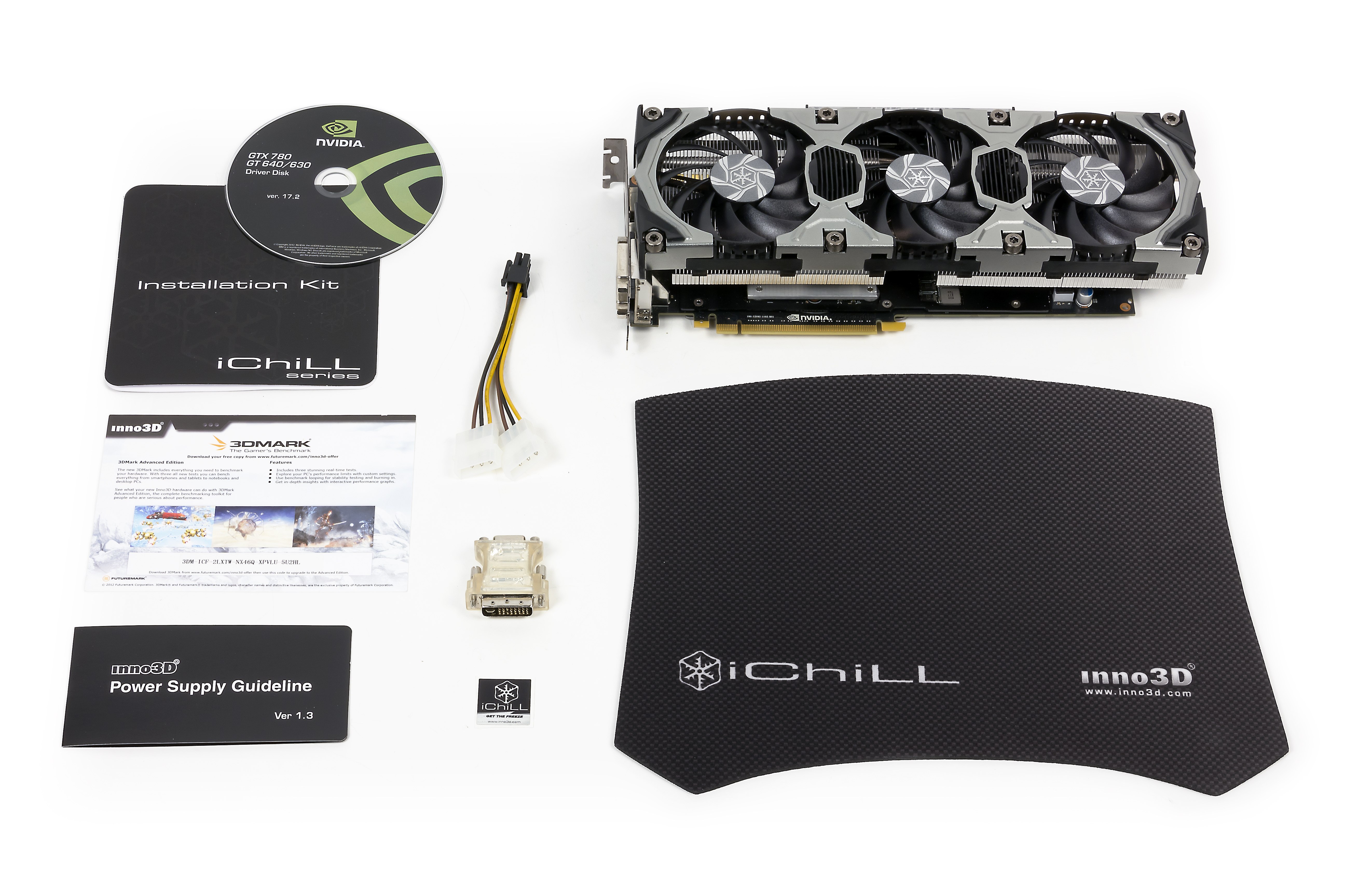Inno3D Geforce GTX 780 iChill 3072 МБ 384-битной GDDR5 PCI-E — отличный представитель одного из топовых продуктов Nvidia, имеющий великолепную систему охлаждения, которая не только очень эффективна и тиха, но и поддается простой разборке и чистке без демонтажа с карты. Ускоритель работает на значительно повышенных частотах, что делает его более привлекательным в сравнении с конкурентами. Также у продукта отличный комплект поставки, в котором есть бонусы в виде лицензионной версии 3DMark (Advanced Edition) и фирменного коврика для мыши.