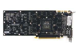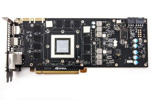 Перед нами полная копия эталонной карты — вплоть до того, что на PCB нанесен логотип Nvidia. Следует отметить, что хотя размеры карты не выходят за рамки принятых стандартов для топовых ускорителей (270×100 мм), очень громоздкая СО значительно увеличивает габариты ускорителя, который занимает 3 слота в системном блоке. Система питания имеет 6 фаз для ядра и 2 фазы для микросхем памяти.