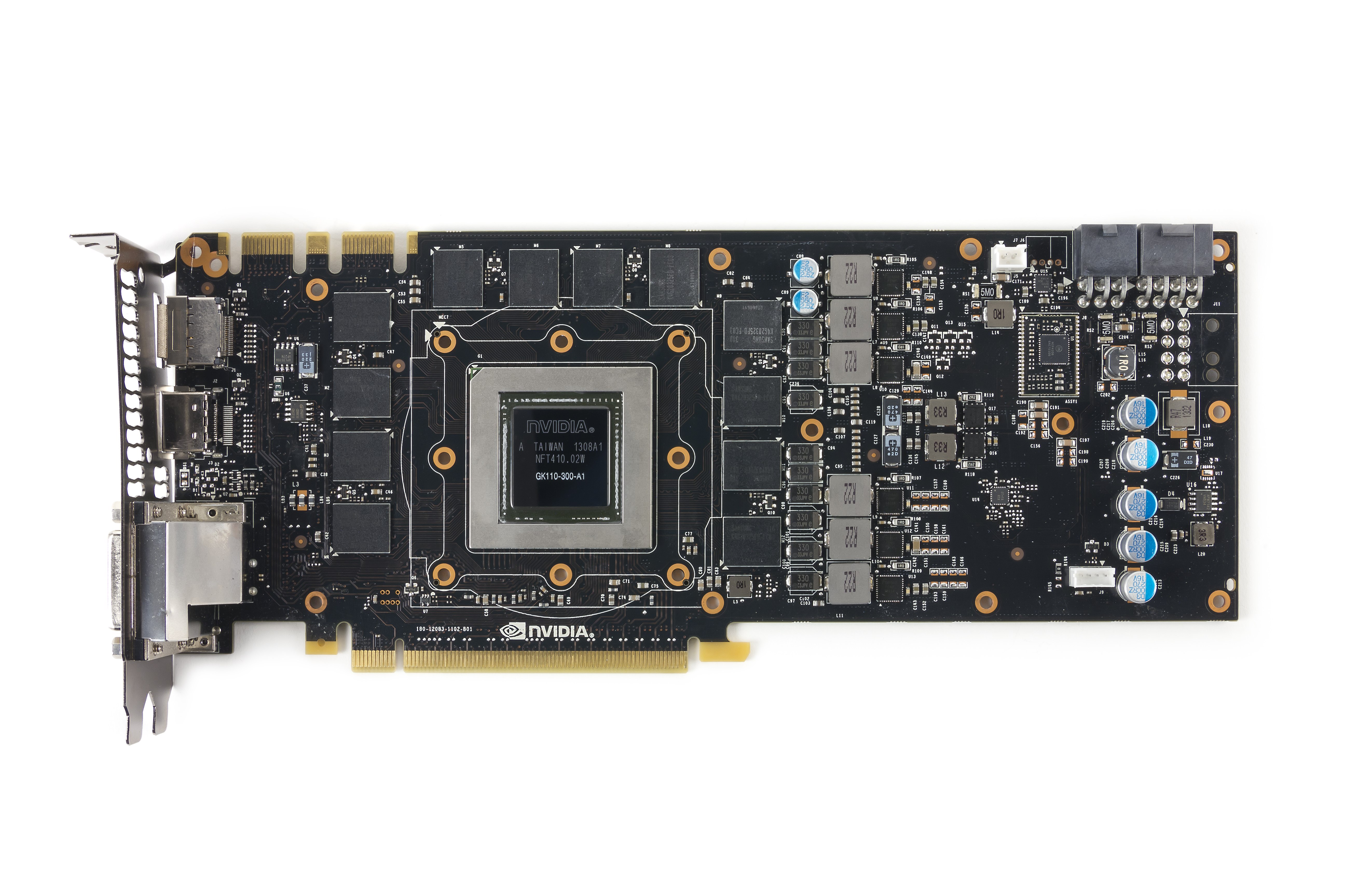 Картa имеeт 3072 МБ памяти GDDR5 SDRAM, размещенной в 12 микросхемах на лицевой стороне PCB.  Микросхемы памяти Samsung (GDDR5). Микросхемы расчитаны на максимальную частоту работы в 1500 (6000) МГц.  | ![]()  |