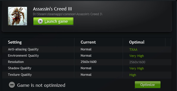 Чтобы помочь простым пользователям, Nvidia разработала и выпустила программное обеспечение Geforce Experience (GFE), о котором мы уже писали. Вместо того, чтобы тратить много времени на поиск правильной комбинации графических настроек вручную, Geforce Experience может сделать всё за игрока. GFE практически при помощи одного клика мышью позволяет оптимизировать игровые настройки для всех найденных на ПК игр, исходя из аппаратной конфигурации системы (центрального процессора и видеокарты). При этом обеспечивается как достаточная производительность, так и максимально возможное качество для данной системы. Вот как это выглядит для игры Assasin's Creed III для топовой игровой системы из процессора Intel Core i7 3960X и видеокарты Geforce GTX 780:
