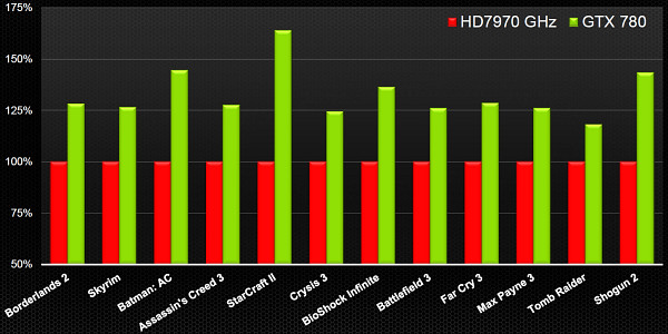 Понятно, что по сравнению с предшествующей моделью Geforce GTX 780 обеспечивает неплохой прирост производительности, а что будет, если сравнить с Radeon HD 7970? Следующая диаграмма показывает сравнение скорости рендеринга новинки с Radeon HD 7970 в нескольких играх в разрешении 2560×1600.