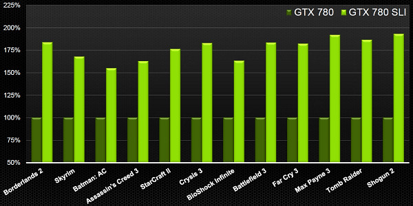 В качестве бонуса рассмотрим масштабируемость SLI на примере связки из двух видеокарт GTX 780. Одночиповая и двухчиповая конфигурации тестировались в Nvidia также в разрешении 2560×1600 в том же наборе игр, и для измерения скорости рендеринга использовался новый пакет утилит FCAT, о котором мы уже писали. Благодаря программно-аппаратным решениям Nvidia, плавность видеоряда в играх достаточно высока, и результат FCAT почти не отличается от того, что показывает FRAPS, так как отброшенных и неполноценных кадров очень мало.