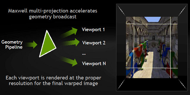 Для решения проблемы эффективности VR-рендеринга, компанией Nvidia была придумана технология Multi-Res Shading, разработанная специально для систем виртуальной реальности и использующая возможности мультипроецирования (multi-projection) — все графические процессоры Maxwell второго поколения умеют одновременно проецировать геометрию сцены на несколько проекций.