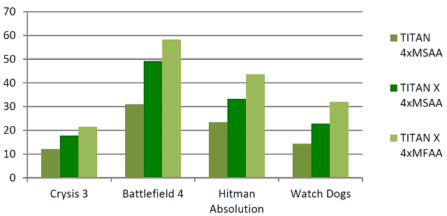 В результате, картинка с включенным MFAA выглядит практически как с MSAA, но потери производительности при этом значительно ниже. К примеру, MFAA 4x обеспечивает скорость на уровне MSAA 2x, а качество сглаживания близко к MSAA 4x. Поэтому в тех играх, где производительности для достижения высокой частоты кадров недостаточно, применение MFAA будет вполне оправдано и может улучшить качество. Вот пример получаемой производительности с MSAA и MFAA на видеокарте Titan X по сравнению с обычной Titan (в 4К-разрешении):
