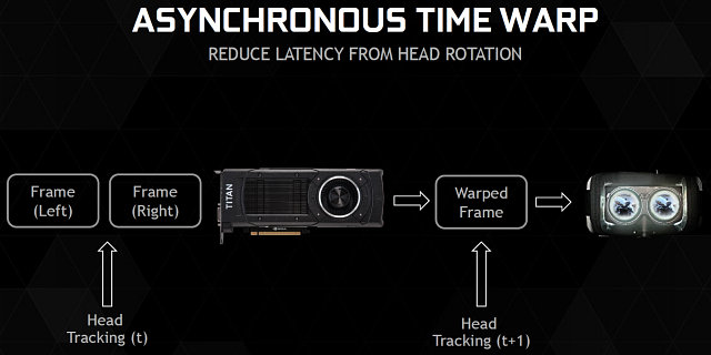 Для того, чтобы снизить эту задержку, программное обеспечение VR Direct от Nvidia поддерживает такую возможность, как асинхронное искажение времени (asynchronous time warp). С применением асинхронного искажения времени, отрендеренная некоторое время назад сцена может сдвигаться, основываясь на более поздних движениях головы игрока, которую захватили сенсоры шлема. Это сокращает задержку между действием и выводом изображения, так как GPU не нужно перерасчитывать весь кадр полностью перед сдвигом. Компания Nvidia уже предоставляет драйверную поддержку для разработчиков VR-приложений, и они могут применить асинхронное искажение времени в своём ПО.