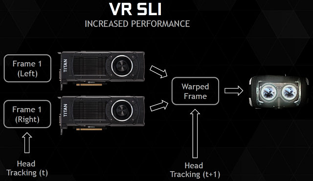 Кроме задержки вывода, очень важным для достижения комфортного геймплея в шлеме виртуальной реальности является не просто обеспечение высокой частоты кадров, а вывод кадров для каждого глаза с максимально плавной их сменой. Соответственно, после популяризации VR-шлемов будущего поколения, многие из игроков захотят опробовать из в современных играх, весьма требовательных к мощности GPU. И в некоторых случаях придётся создавать двухчиповую SLI-конфигурацию из пары мощнейших видеокарт вроде Geforce GTX Titan X.