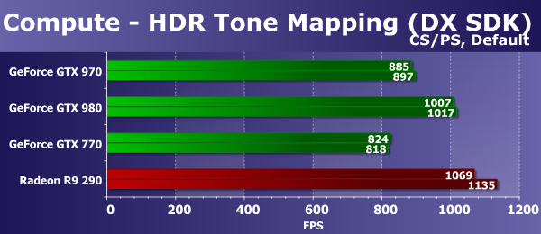 В изменившихся условиях новая видеокарта Geforce GTX 970 также опережает аналогичную модель из предыдущего поколения — GTX 770, оказываясь между последней и GTX 980. От своего более производительного собрата на GM204 она отстаёт на 15-18%, а отставание от главного ценового конкурента в виде Radeon R9 290 лишь увеличилось — в подобных вычислениях чипы компании AMD явно сильны, так как они предпочитают попиксельные вычисления.