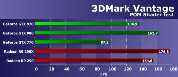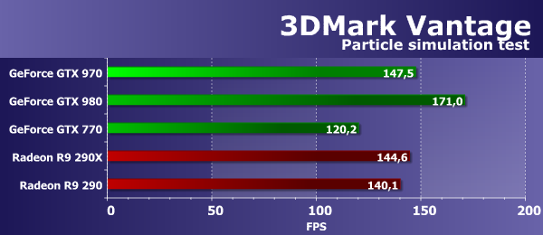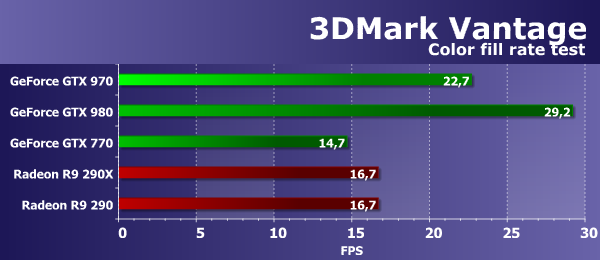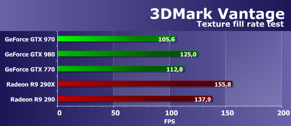 Цифры второго подтеста 3DMark Vantage показывают производительность блоков ROP, иногда — с учетом величины пропускной способности видеопамяти (т. н. «эффективный филлрейт»), поэтому тест измеряет пропускную способность и/или производительность ROP, и в этот раз похоже на второе. Результат у рассматриваемой сегодня топовой платы Geforce GTX 970 намного (более чем в полтора раза) лучше, чем у GTX 770, а старшей GTX 980 новинка уступила тоже немало — 17%.