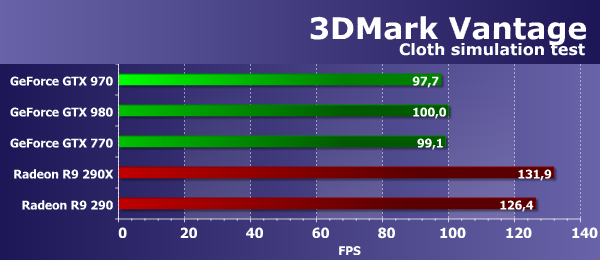 Новинка немного (13%) проигрывает и своему сопернику по цене в виде AMD Radeon R9 290, что объясняется тем, что графические процессоры производства компании AMD в этой задаче работают весьма эффективно, ну а теперь и новые платы на базе графического процессора GM204 подобрались к Radeon на близкое расстояние. Feature Test 4: GPU Cloth