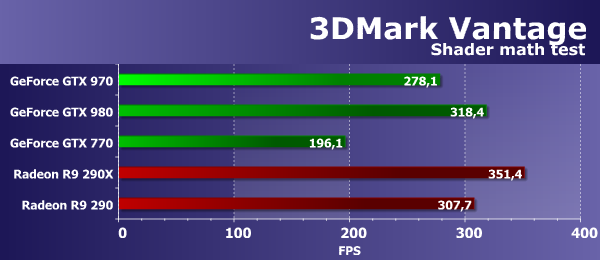 В этом случае производительность решений не полностью соответствует теории, но она близка к тому, что мы видели в других математических тестах. В математическом тесте из пакета компании Futuremark, показывающем пиковую производительность видеочипов в предельных задачах, мы видим отличающееся распределение результатов, по сравнению с аналогичными тестами из нашего тестового пакета. Главным отличием стало то, что результат новинки Geforce GTX 970 теперь ниже, чем у Radeon R9 290.
