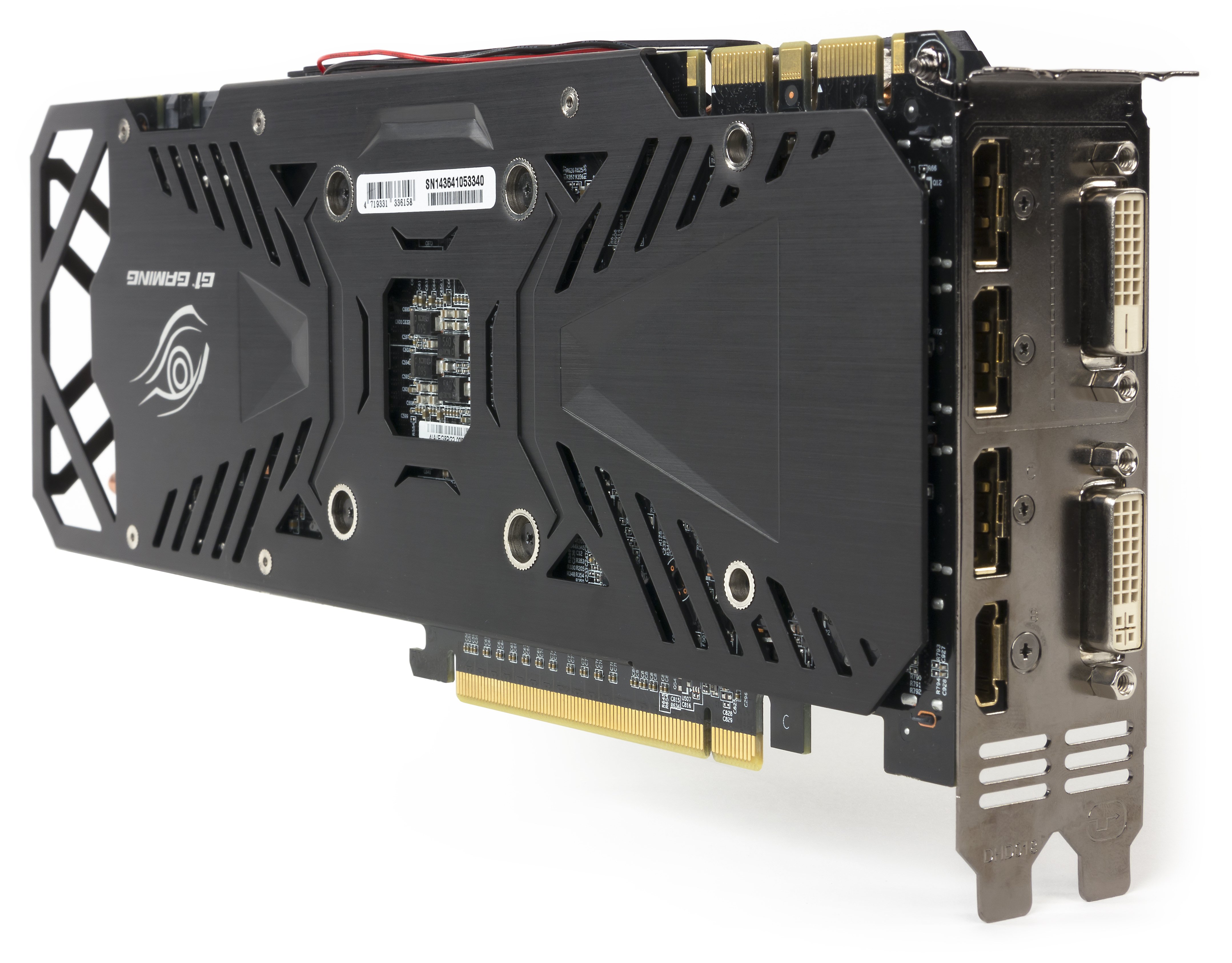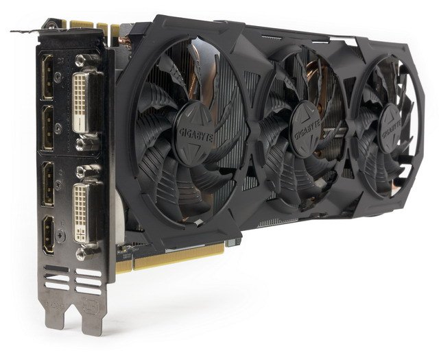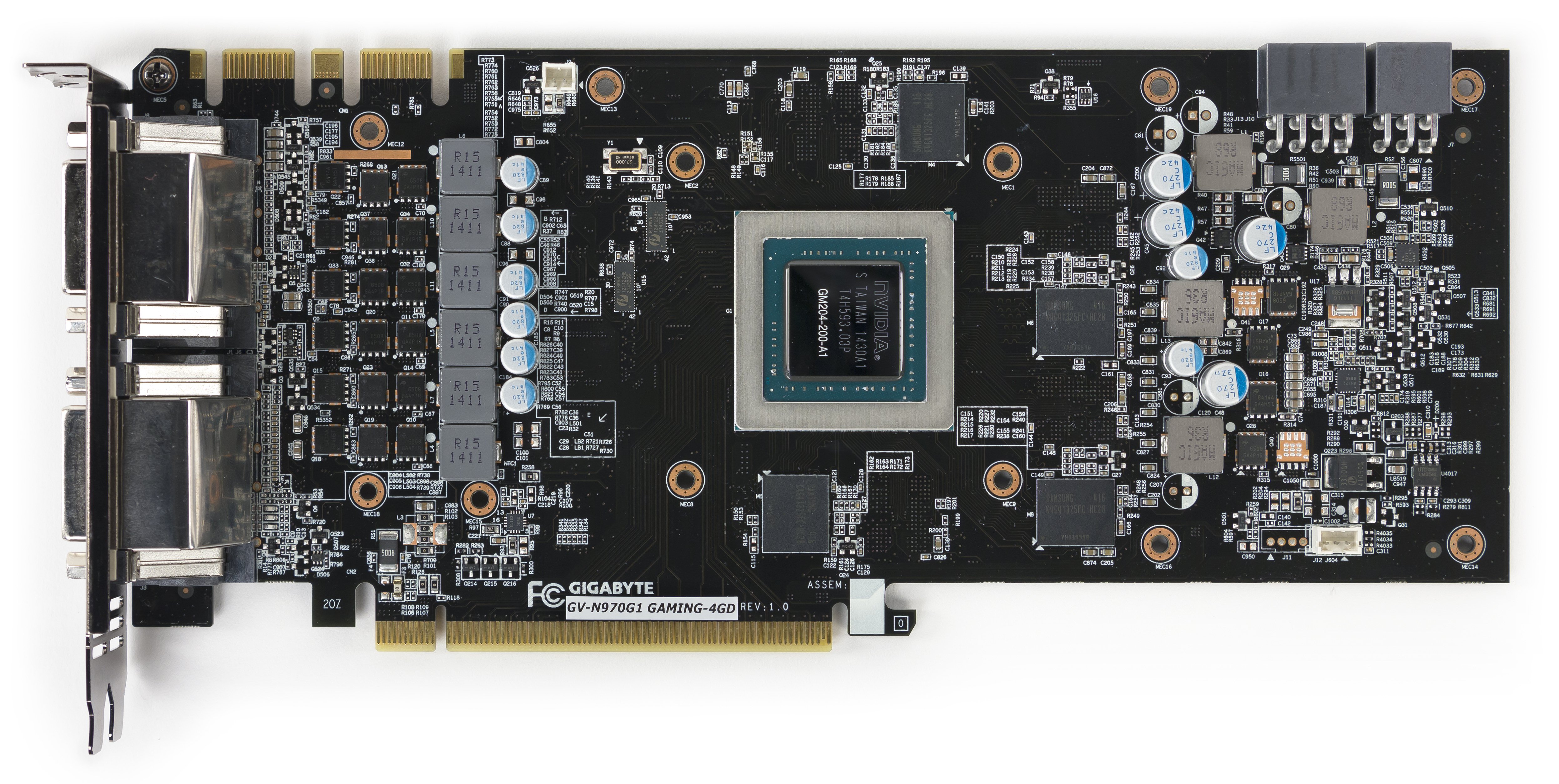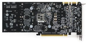 Мы сравниваем с GTX 980, потому что обе карты используют один и тот же GPU, да и шина обмена с памятью у них одинаковая. Тем не менее, Gigabyte использует здесь совершенно иную разводку. Прежде всего, это касается размещения микросхем памяти на обеих сторонах PCB. В результате на печатной плате образовалось много пустого пространства. Почему не сокращены размеры PCB? Возможно, из-за необходимости крепить систему охлаждения больших размеров. Могут быть и иные причины.