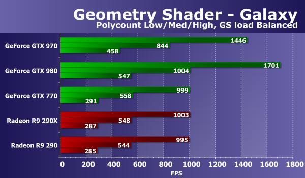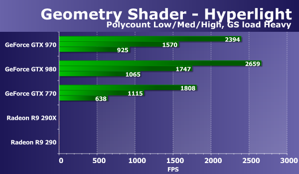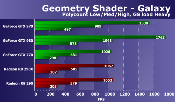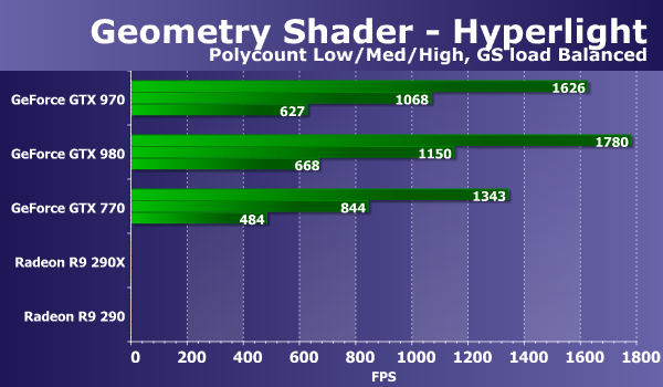 Свежая модель видеокарты Geforce GTX 970 опережает аналогичную GTX 770 из предыдущего поколения чуть ли не вдвое, а отставание от GTX 980 на таком же чипе составляет уже привычные 15-16%. Видеокарты Radeon в этот раз сильно отстают, и это можно объяснить тем, что геометрическая производительность у графических процессоров компании AMD хуже, чем у Nvidia. Особенно отличился новый GM204, который справляется с работой заметно быстрее чем даже GK110. Посмотрим, как изменится ситуация при переносе части вычислений в геометрический шейдер: