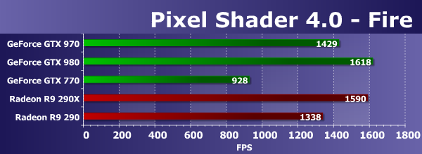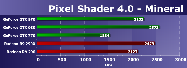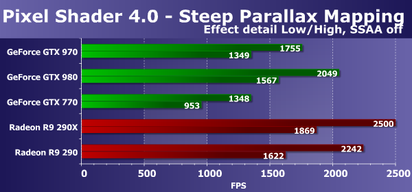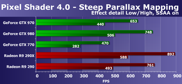 Оба графических решения AMD Radeon и в этом D3D10-тесте пиксельных шейдеров работают явно эффективнее, по сравнению с конкурирующими платами Geforce, но новый чип GM204 слегка изменил ситуацию в лучшую сторону — представленная ранее вторая из топовых плат Geforce GTX 970 на втором чипе архитектуры Maxwell стала заметно быстрее предшествующей Geforce GTX 770 и в самых сложных условиях отстаёт от соперничающей с ней Radeon R9 290 лишь на 10%.
