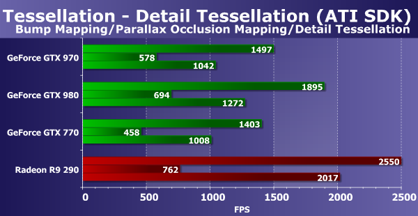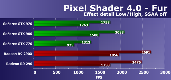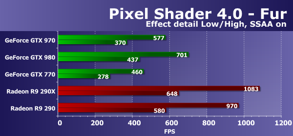 В задачах процедурной визуализации меха с большим количеством текстурных выборок, с выпуском видеочипов на базе архитектуры GCN компания AMD вырвалась вперед по производительности, и сейчас платы Radeon являются лидерами в этих сравнениях, что говорит о значительно более высокой эффективности выполнения ими этих программ. Такой вывод подтверждается и сегодняшним сравнением — представленная недавно видеокарта Nvidia проиграла обоим конкурентам от AMD, в том числе своему главному сопернику в лице Radeon R9 290.