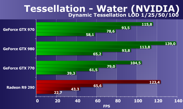 Мы тестируем все видеоплаты при четырех разных коэффициентах тесселяции — в данном случае настройка называется Dynamic Tessellation LOD. При первом коэффициенте разбиения треугольников, скорость не ограничена производительностью геометрических блоков, и видеокарта Radeon R9 290 показывает высокий результат, даже превосходящий скорость анонсированной недавно платы Geforce GTX 970, но уже на следующих ступенях геометрической нагрузки производительность платы Radeon снижается весьма серьёзно, и новинка Nvidia выходит вперёд.