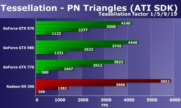 В подтесте с применением лёгкой степени тесселяции, новая плата Nvidia почти наравне с моделью предыдущего поколения Geforce GTX 770, а топовая GTX 980 на 18% быстрее. Если сравнивать новинку с единственной платой производства AMD, то она всё так же серьёзно уступает, так как в этом тесте тесселяции разбиение треугольников весьма умеренное и скорость не упирается в производительность блоков обработки геометрии.