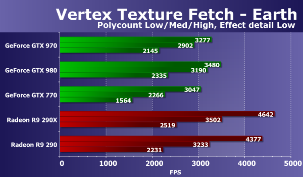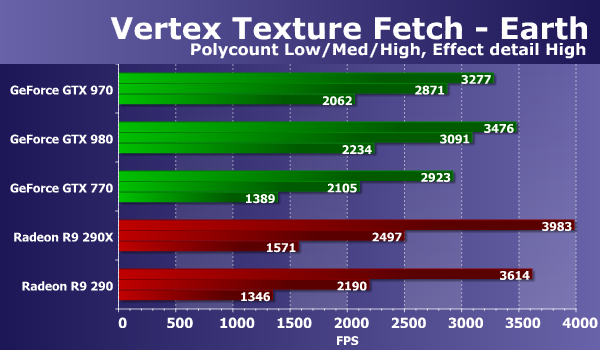 В тестах «Vertex Texture Fetch» измеряется скорость большого количества текстурных выборок из вершинного шейдера. Тесты схожи, по сути, так что соотношение между результатами карт в тестах «Earth» и «Waves» должно быть примерно одинаковым. В обоих тестах используется displacement mapping на основании данных текстурных выборок, единственное существенное отличие состоит в том, что в тесте «Waves» используются условные переходы, а в «Earth» — нет.