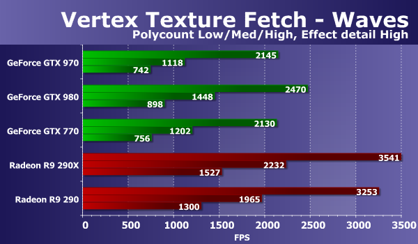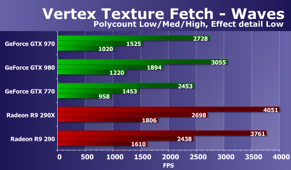 Результаты во втором тесте вершинного текстурирования «Waves» не слишком похожи на то, что мы видели на предыдущих диаграммах. Скоростные показатели всех Geforce в этом тесте сильно ухудшились, и хотя новая модель Nvidia Geforce GTX 970 чуть быстрее GTX 770, но разница мизерная, а старшей модели GTX 980 новинка проигрывает и вовсе до 19%. Если сравнивать её с конкурентами, то обе платы серии Radeon R9 290 смогли показать лучшую производительность в этом тесте. Рассмотрим второй вариант этой же задачи: