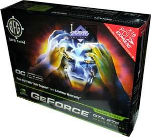 BFG Geforce GTX 275 OC 896MB PCI-E — стандартный референс. Ничего особенного в плане конструктива продукт не представляет. Имеет чуть более высокие частоты, потому имея результаты по стандартному GTX 275, а также по картe от Zotac, можно легко понять — какой уровень занимает продукт BFG. Производитель предоставляет 10 летнюю гарантию на продукт после регистрации у него на сайте.