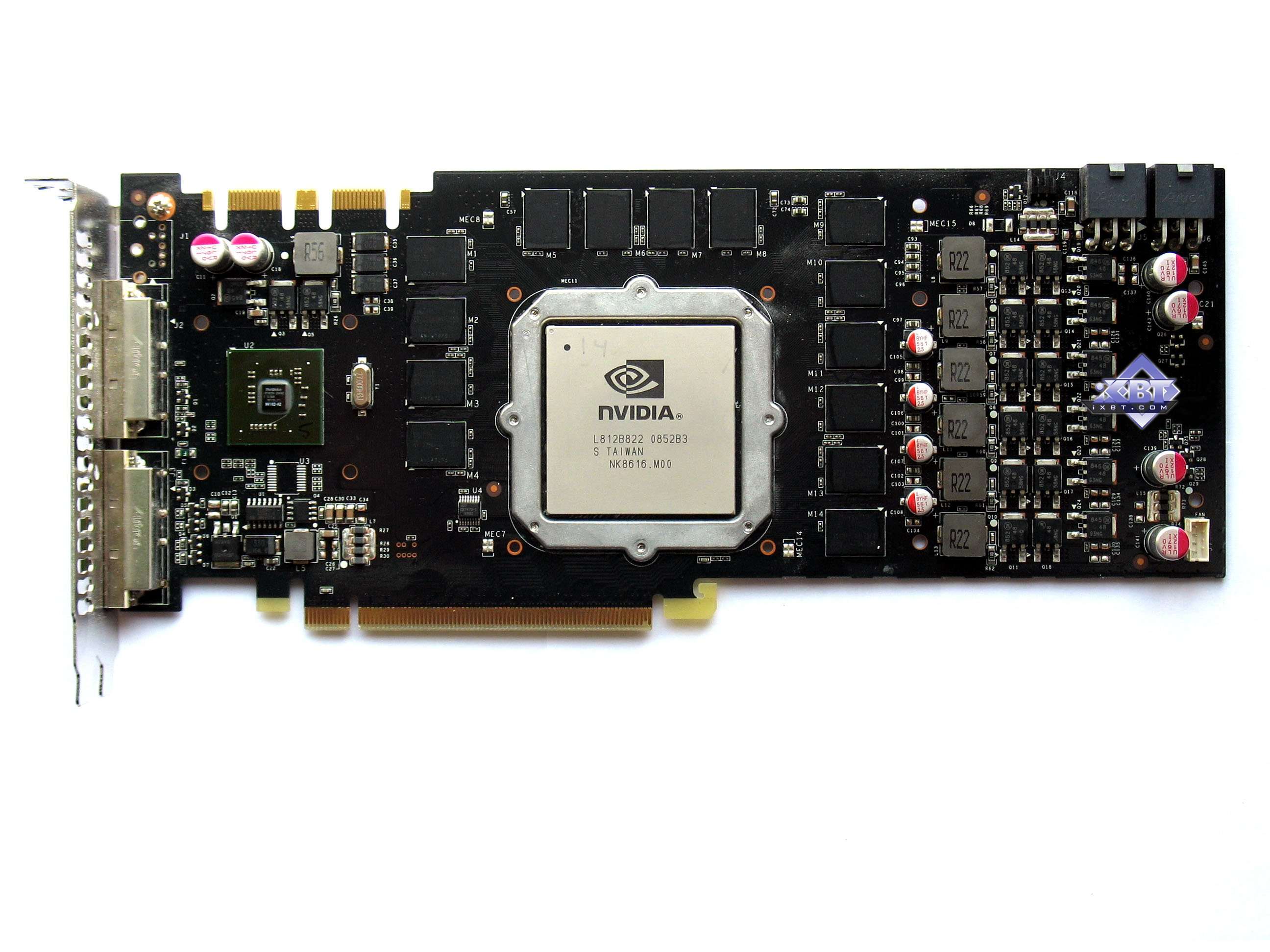 - Интерфейсы (два RAMDAC, два Dual Link DVI, HDMI, DisplayPort, HDTV) интегрированы на отдельный чип