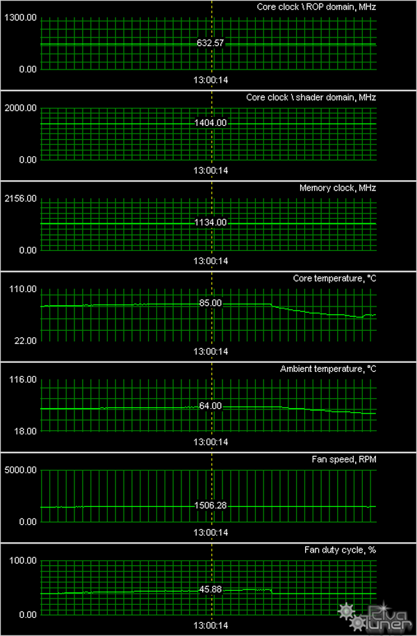 Мы провели исследование температурного режима с помощью утилиты RivaTuner (автор А.Николайчук AKA Unwinder) и получили следующие результаты (поскольку все карты работают на одинаковых частотах и представляют собой просто копии одной и той же платы, то приведем общий результат):