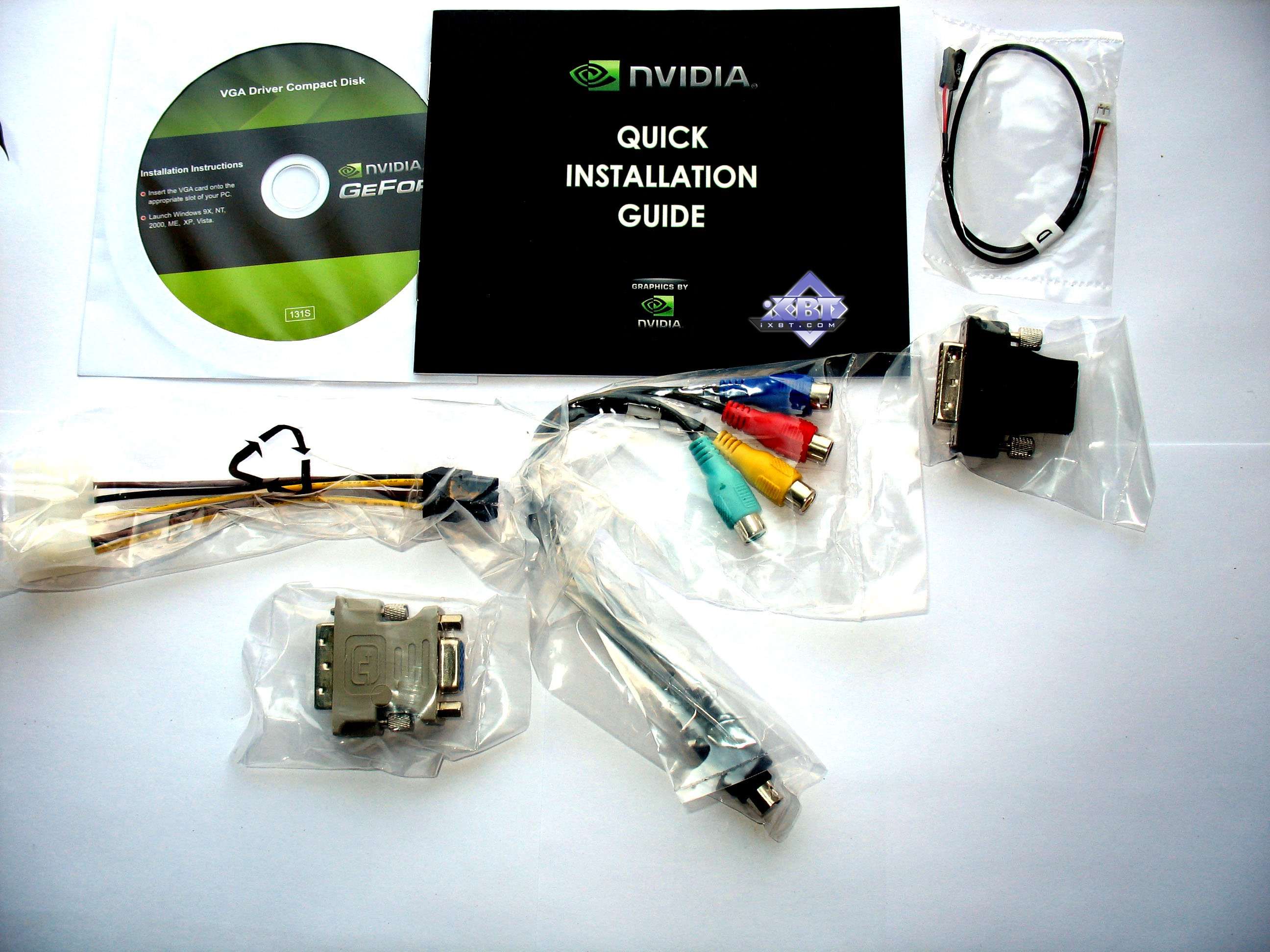 Базовый комплект поставки должен включать в себя: руководство пользователя, диск с драйверами и утилитами, переходник-адаптер DVI-to-VGA, аудио-шнурок, DVI-to-HMDI адаптер, адаптер компонентного вывода (TV-out), а также разветвитель внешнего питания. Ниже мы покажем, что предлагается к каждой карте дополнительно.
