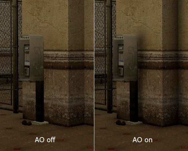 На этих фрагментах скриншотов виден эффект от форсированного AO в Half-Life 2. Слева изображен обычный режим рендеринга, где освещение «плоское», а справа включен Ambient Occlusion. При включении AO углы между поверхностями затеняются, так как на них попадает меньше света, ведь они загорожены другими объектами. В итоге получается более реалистичное изображение с глубиной и объёмом.