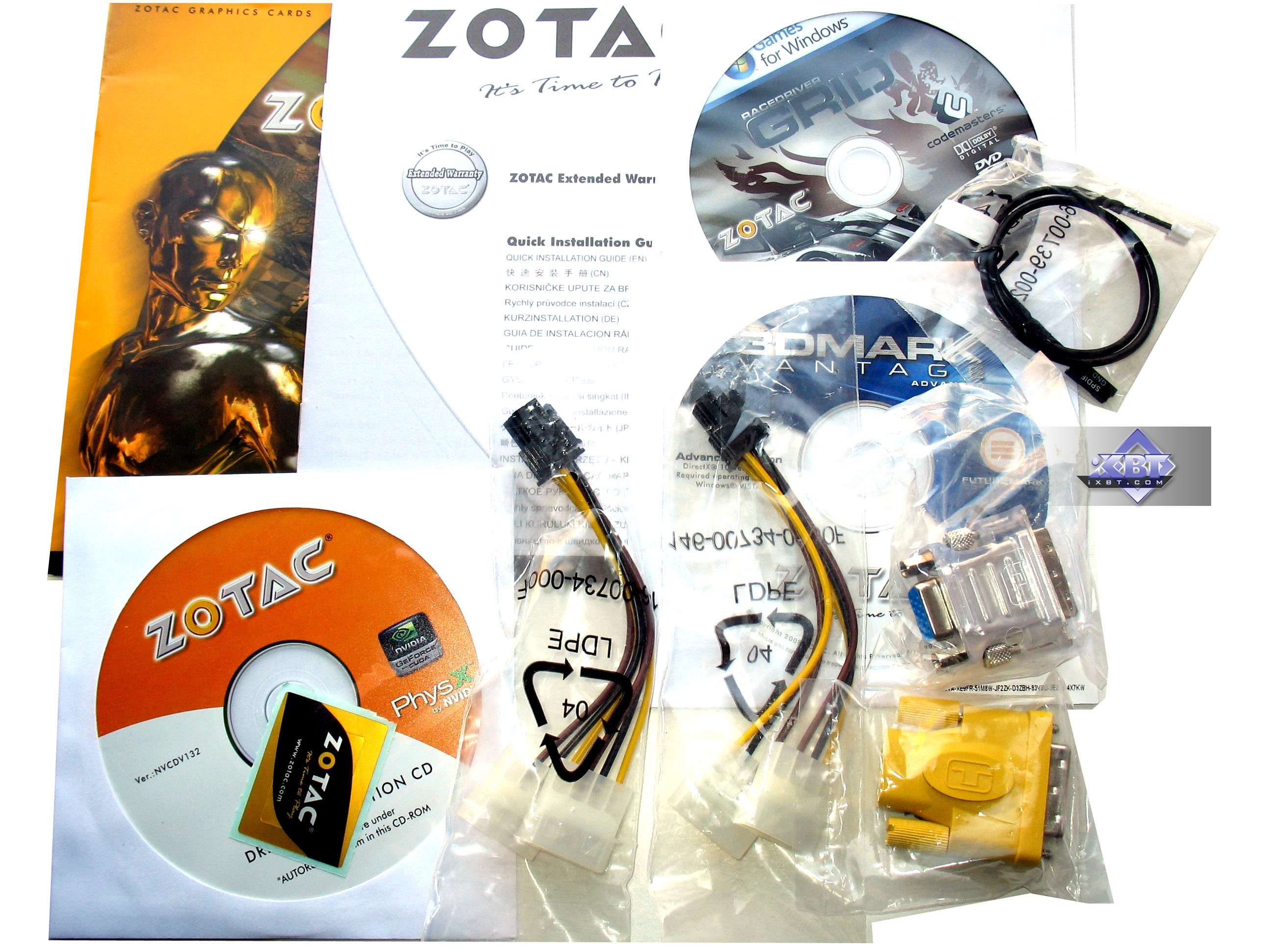 Карты от Zotac и Palit имеют гнездо TV-выхода, которое оно уникально по разъему, и для вывода изображения на ТВ как через S-Video, так и по RCA, требуются специальные адаптеры-переходники, поставляемые вместе с картой. Более подробно о ТВ-выходе можно почитать здесь.