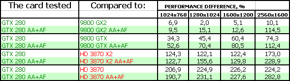 Вы посмотрите — какие отменные результаты у нового ускорителя относительно 9800 GTX! Не было бы 9800 GX2, то можно сказать, что вышел второй G80 и принес не менее революционные приросты. Однако Nvidia, зная, что впереди GT200, зачем-то выпустила двухпроцессорный гигант из двух G92, владельцы которого уже могут не смотреть на GTX 280. Более того, новинка еще и дороже, а в ряде тестов проигрывает.