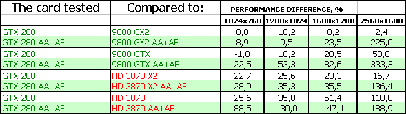 Эта игра заточена под DX9, имеет сильное требование к скорости мультитекстурирования, поэтому GTX 280 не одолел более мощного с точки зрения филлрейта собрата, или же просто DX9-технологии совместно с SLI отлажены более сильно и выдают намного более высокие результаты, нежели в DX10. Последний вывод кажется более правомерным.