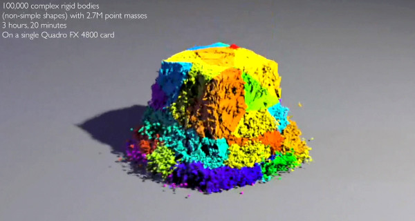 И если с ресурсами людей, занятых в производстве эффектов, поделать ничего особенно нельзя, то с требуемыми вычислительными мощностями вполне могут помочь графические процессоры. Ричард показал зрителям несколько визуализаций, которые были полностью сделаны на GPU, и в которых ими был отмечен значительный прирост производительности, по сравнению с расчётами на CPU.