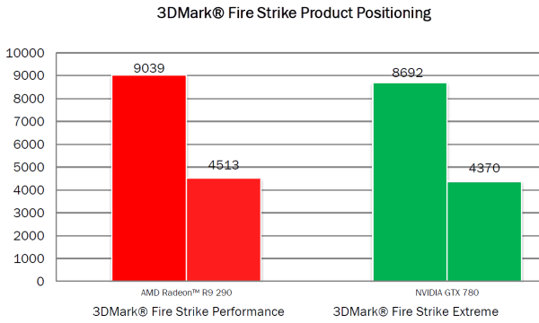 Посмотрим, как сама компания AMD позиционирует свое новое решение на рынке с использованием традиционного инструмента Fire Strike в двух разных версиях (Performance и Extreme) из последней версии бенчмарка Futuremark 3DMark. Этот бенчмарк отлично подходит для современных видеокарт компании AMD, и количество очков, набранное в нем видеокартой Radeon R9 290, немного превосходит производительность главного конкурента — Geforce GTX 780.