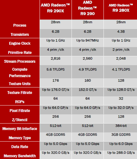 Рассмотрим теоретические показатели производительности новинки, прикинув, насколько новая видеокарта Radeon R9 290 должна быть медленнее верхней модели Radeon R9 290X в реальности и насколько она сравнима с R9 280X, известной ранее как Radeon HD 7970 GHz. Сравниваем все важнейшие для графических процессоров теоретические показатели: