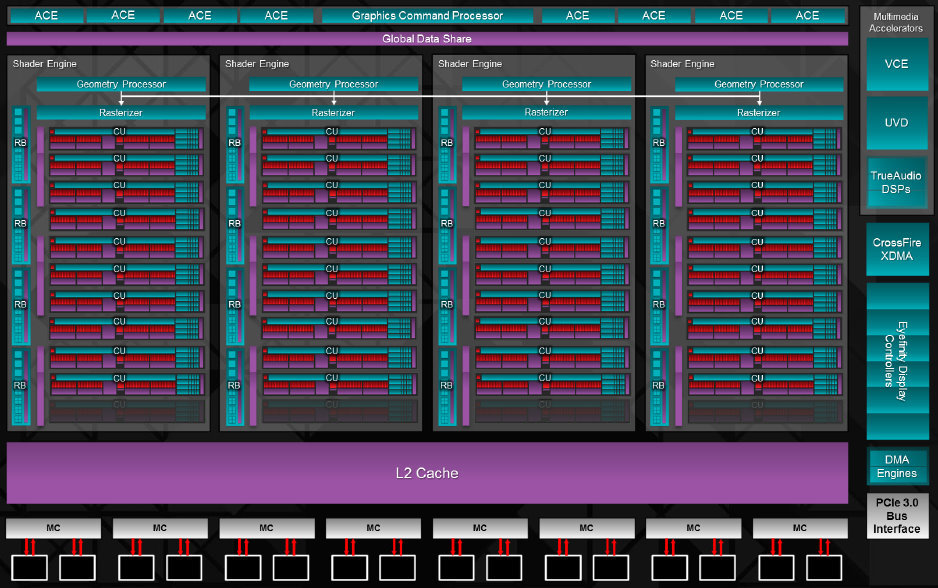 Графический процессор Hawaii состоит из четырех Shader Engine, каждый из которых физически содержит по 11 укрупненных вычислительных блоков Compute Unit, включающих текстурные модули, геометрический процессор и растеризатор, а также блоки ROP. Всего в состав графического чипа Hawaii входит: 44 вычислительных блока Compute Units, содержащих 2816 потоковых процессоров, 64 блока ROP и 176 блоков TMU.