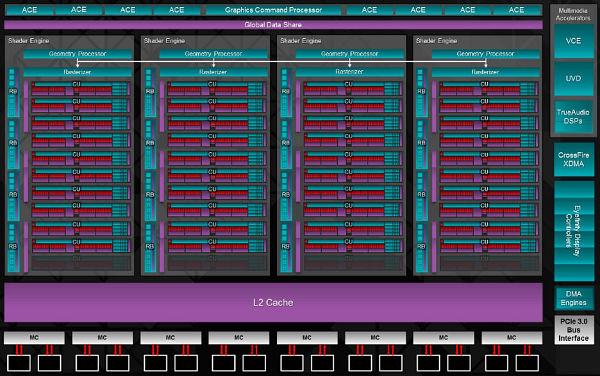 Отметим, что чип Hawaii имеет четыре блока обработки геометрии и движков растеризации и умеет обрабатывать до четырех геометрических примитивов (треугольников) за такт. Также в Hawaii была улучшена буферизация геометрических данных и увеличены кэши для параметров геометрических примитивов, что обеспечивает серьезный рост производительности при больших объемах расчетов в геометрических шейдерах и активном использовании тесселяции.