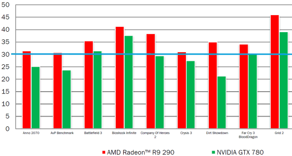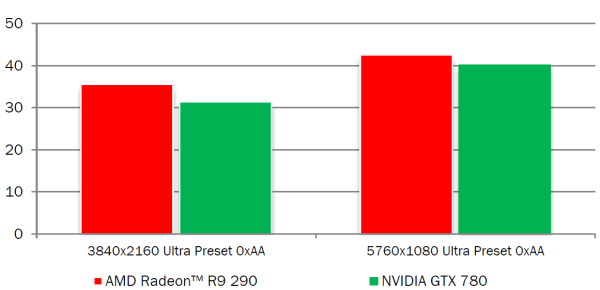 В этой игре свежая модель Radeon R9 290 пусть и немного, но все же опережает более дорогую конкурирующую плату Nvidia Geforce GTX 780 от в обоих режимах с разным (но высоким в обоих случаях) разрешением. Возможно, видеокарте Nvidia в таких высоких разрешениях мешает нехватка видеопамяти, которой у нее лишь 3 ГБ, в отличие от 4 ГБ у Radeon R9 290, так что больший объем видеопамяти является еще одним неоспоримым достоинством новинки компании AMD.