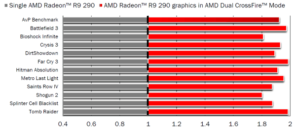 В случае пары видеокарт Radeon R9 290, технология CrossFire обеспечивает прекрасное масштабирование в многочиповых системах, если брать в расчет среднюю частоту кадров. На следующей диаграмме показана сравнительная производительность одиночной AMD Radeon R9 290 и двух таких карт, работающих над рендерингом по технологии AMD CrossFire: