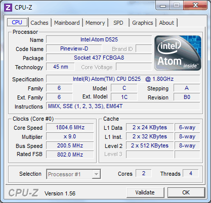 Про соперников Zacate всё давно известно, Atom D525 двухъядерный, работает на частоте 1,8 ГГц и умеет выполнять одновременно четыре потока инструкций. В целом, это два CPU, схожих по классу, и основное их отличие в поддержке внеочередного исполнения команд CPU ядрами Zacate и последовательного для Atom.