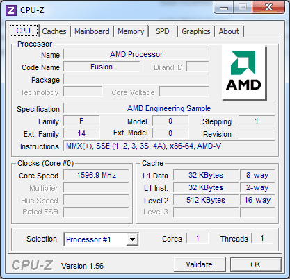 Утилита CPU-Z пока мало что может сказать о Zacate, но частоту CPU определила правильно, а также набор поддерживаемых инструкций и размер кэшей. Инженерный образец APU видится утилитой не как двухъядерный процессор, а как двухпроцессорная система. В остальном — любопытен набор инструкций, в нём теперь есть SSSE3 и SSE4A, но нет 3DNow!. Зато поддерживаются 64-битные инструкции и технология виртуализации.